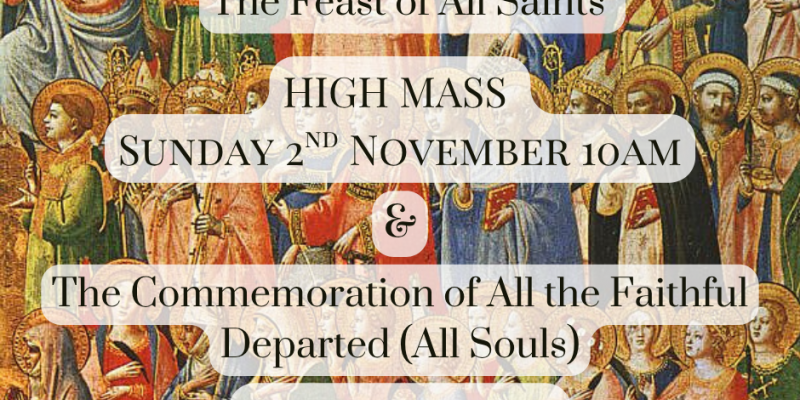 This year the Feast of All Saints falls on a Saturday with All Souls on a Sunday. Due to this on Sunday 2nd November we will be celebrating All Saints with a High Mass at 10am and then in the evening a Requiem Mass for All Souls at 7pm, replacing Evensong and Benediction. Do join us for these import...